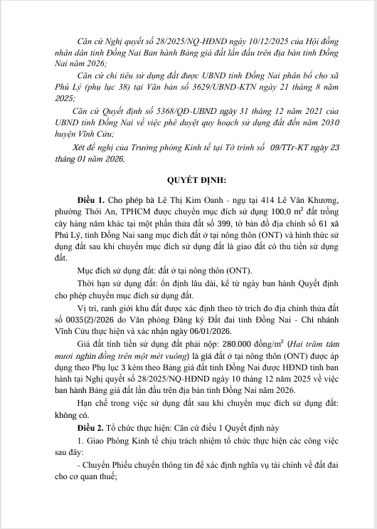 Về việc cho phép chuyển mục đích sử dụng đất tại thửa đất số 399