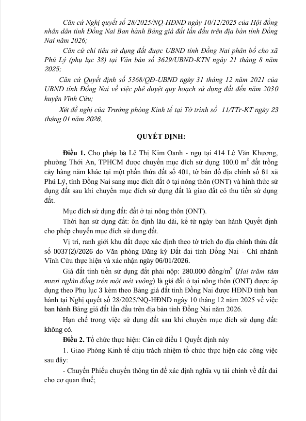 Về việc cho phép chuyển mục đích sử dụng đất tại thửa đất số 401 tờ bản đồ địa chính số 61, xã Phú Lý